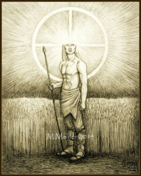 >A man fair and tall, with a great head of curly yellow hair. He has a green mantle wrapped about him and a brooch of white silver in the mantle over his breast. Next to his white skin, he wears a tunic of royal satin with red-gold insertion reaching to his knees. He carries a black shield with a hard boss of white-bronze. In his hand a five-pointed spear and next to it a forked javelin. Wonderful is the play and sport and diversion that he makes (with these weapons). But none accosts him and he accosts none as if no one could see him.>…they were not long there when they saw an army and a goodly host coming towards them from the East, and in the vanguard there was one young man high in authority over all; and like to the setting sun was the radiance of his face and forehead, and they were unable to gaze upon his countenance on account of its splendour. And this is who it was - Lugh Lamhfhada Loinnbheimionach…from the Land of Promise…and when the Cathbarr (Manannan's helmet) was let off of him the appearance of his face and forehead was as brilliant as the sun on a dry summer's day.